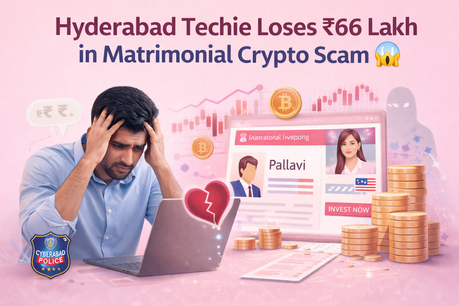 Synopsis: A 29-year-old IT employee from Hyderabad was allegedly cheated of nearly Rs. 66 lakh by a woman he met on a matrimonial website. The accused reportedly lured him into stock market and cryptocurrency investments by promising high returns. Cyberabad Police have registered a case and launched an investigation.
